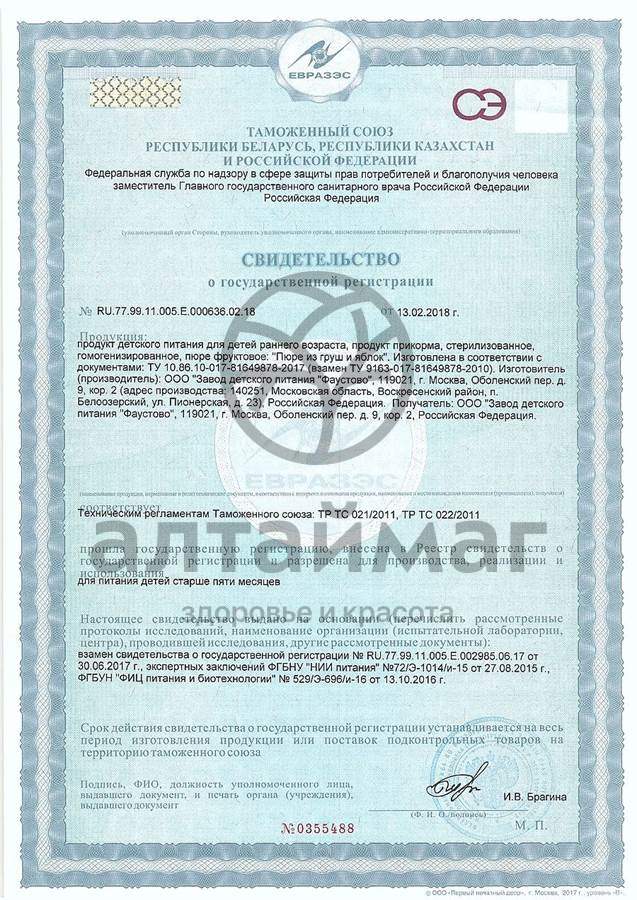 Гомогенизированное стерилизованное пюре из груш и яблок для питания детей раннего возраста (с 5 месяцев). Без добавления сахара.