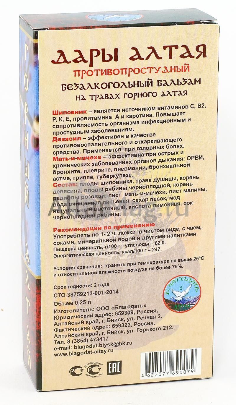 Состав Бальзама дары алтая противопростудного