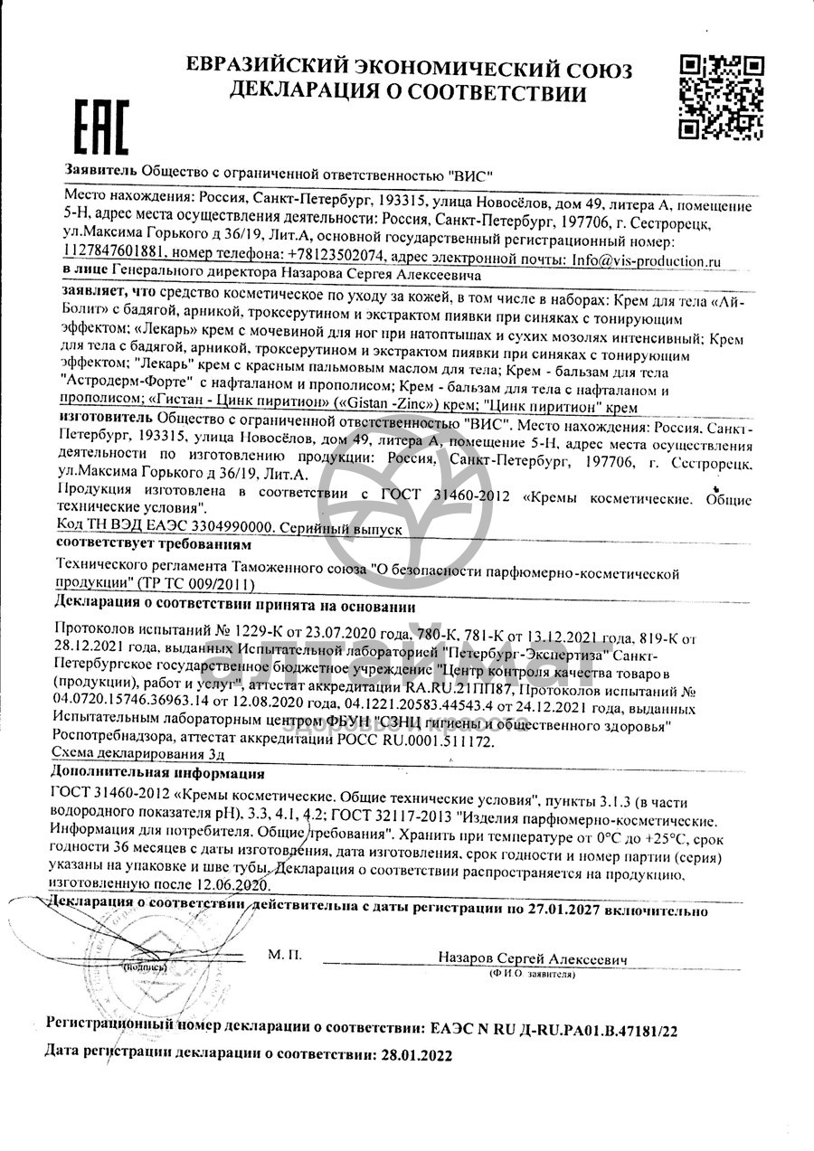 «Гистан - Цинк пиритион» крем для ухода за кожей, склонной к раздражению и шелушению. 1 г крема содержит 2 мг цинк пиритиона в виде активных дисперсных микрочастиц. Активные компоненты крема способствуют устранению шелушения, зуда и покраснение кожи. Крем смягчает, успокаивает поврежденную кожу. В первые минуты нанесения крема возможно ощущение лёгкого покалывания или жжения. Подходит для длительного использования.