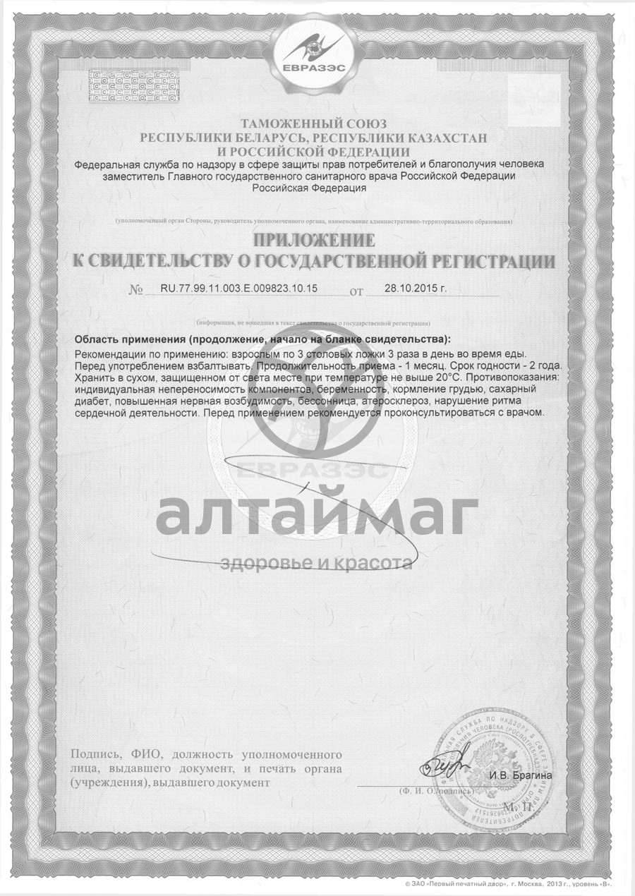 Трава хвоща полевого, чага, мумие алтайское черное и белое (каменное масло), трава мелиссы, корневище с корнями радиолы четырехчленной, зародыши пшеницы обыкновенной, пыльца цветочная, чеснок посевной, вода питьевая, бензоат натрия.Рекомендации по применению