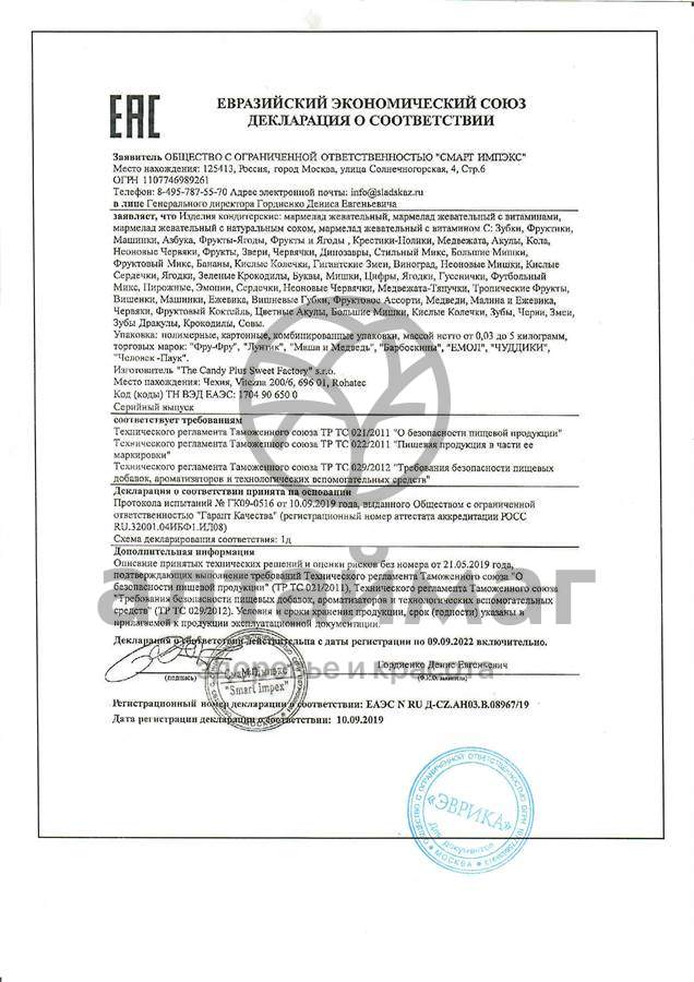 сироп глюкозы, сахар, вода питьевая, сок виноградный концентрированный, желатин пищевой, регулятор кислотности: лимонная кислота; загуститель: пектины; концентрат бузины, концентрат спирулины, экстракт сафлора, концентрат сока черной моркови, ароматизаторы натуральные: клубника, ананас, апельсин, черная смородина, груша; масло кокосовое рафинированное; глазирователь: карнаубский воск.