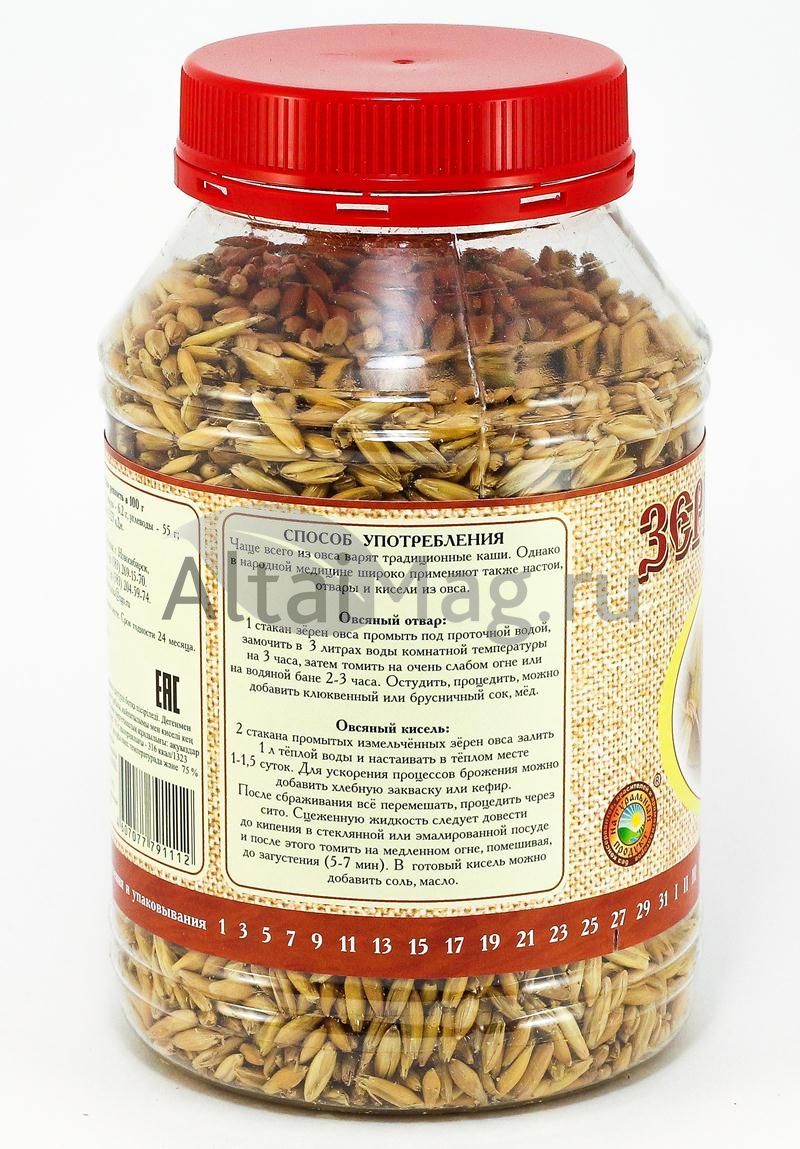 Зерно овса обладает высокой биологической активностью, оно богато белками, витаминами группы В, РР, Е, Д, ферментами, макро- и микроэлементами (кальций, кремний, магний, фосфор, железо, марганец, цинк). Зерно овса также содержит полисахарид-глюкан, обладающий способностью снижения холестерина в крови. Указания на лечебные свойства овса имеются в популярном трактате тибетской медицины восемнадцатого века Дзэйцхар Мигчхан, в работе А.Т.Болотова "О врачебных качествах овса". Отвары зёрен овса, кисели входят в состав диет при желудочно-кишечных и почечно-каменных заболеваниях, используются для очистки печени, при интоксикациях. Известны их успокаивающее, мочегонное и желчегонное действие. Издревле в народной медицине отвары зёрен овса употреблялись как профилактическое и общеукрепляющее средство. Овсяная каша является традиционной утреней пищей у многих народов. Предлагаемые зёрна овса вырабатываются из специально подобранных сортов данного злака и технологически подготовлены для использования в домашних условиях.
